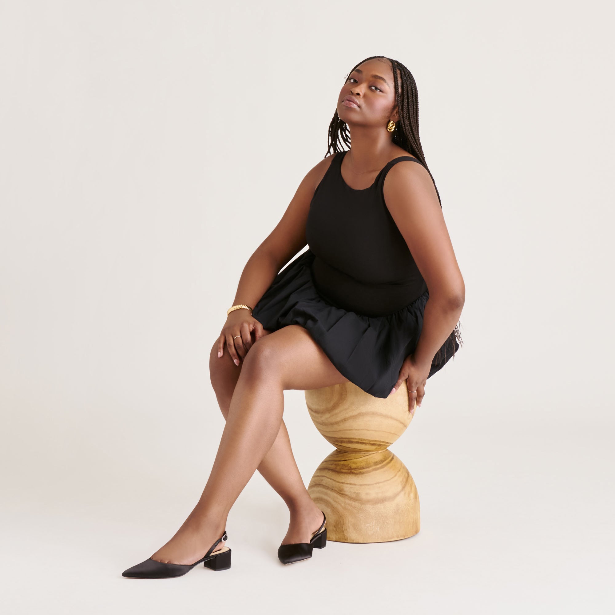 Classically simple CAREL is easy to wear and easy to dress up. Minimalist yet regal. this slingback features a comfy low block heel. pointed toe. and on-trend colorways in sophisticated satin. Wear this sustainably-crafted style to your next event.?