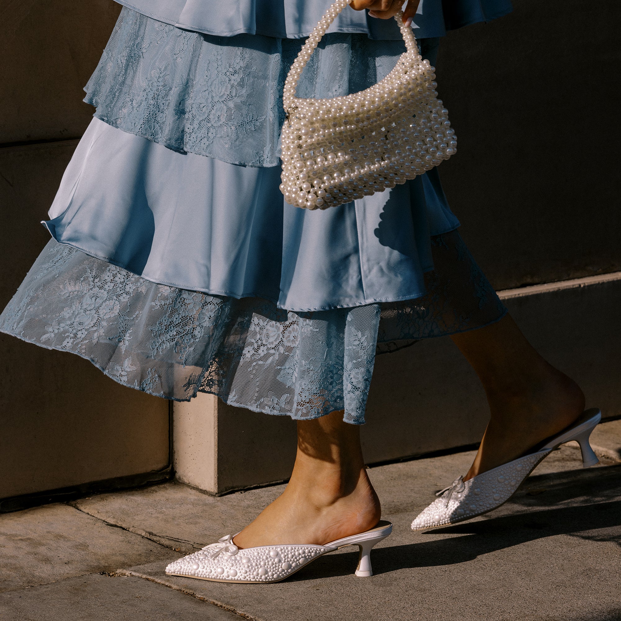 Dotted with pearls and topped with a bow. CLAYTN PEARL is the picture of poise. This sustainable stunner is your go-to for wedding season or elevated lunch dates.