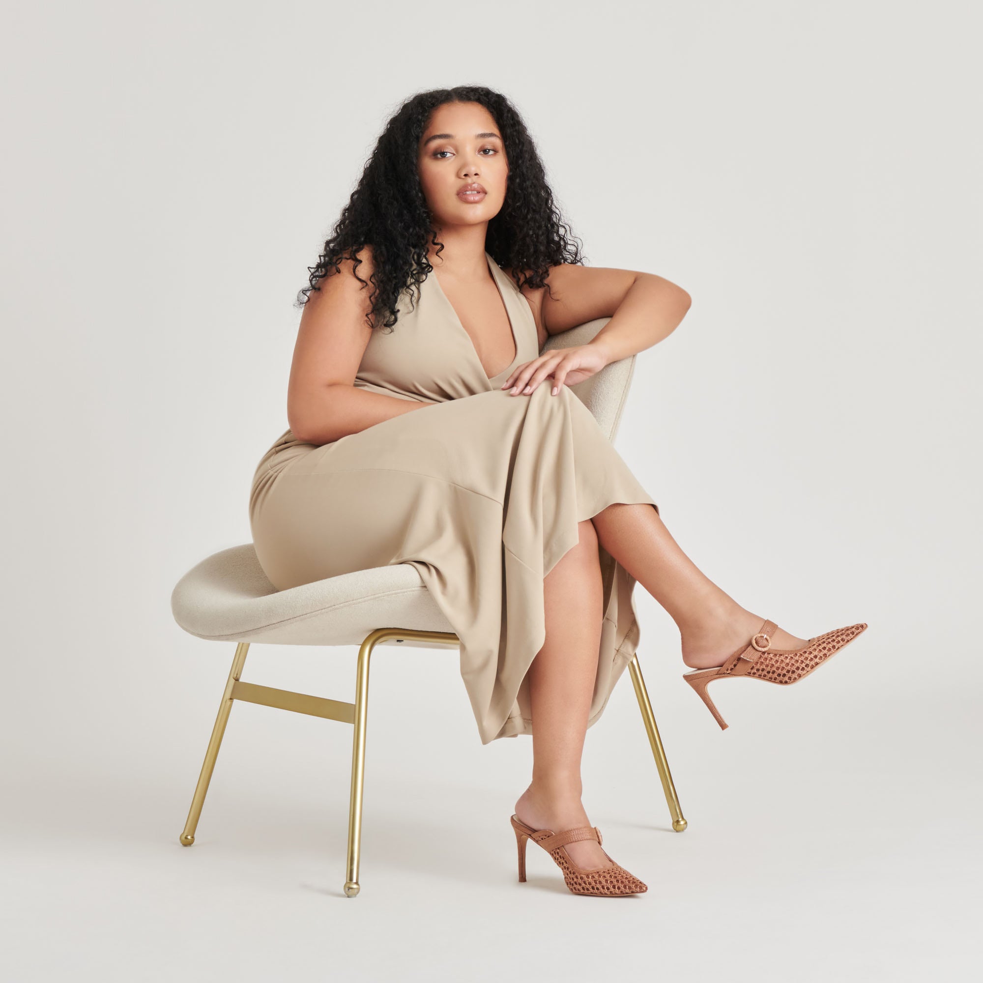 In a word. KEEKEE is unique. This stiletto mule sports woven raffia. a pointed toe. and woven buckle at the top to keep you secure. Made from recycled materials. make a statement this spring in light natural or saddle.