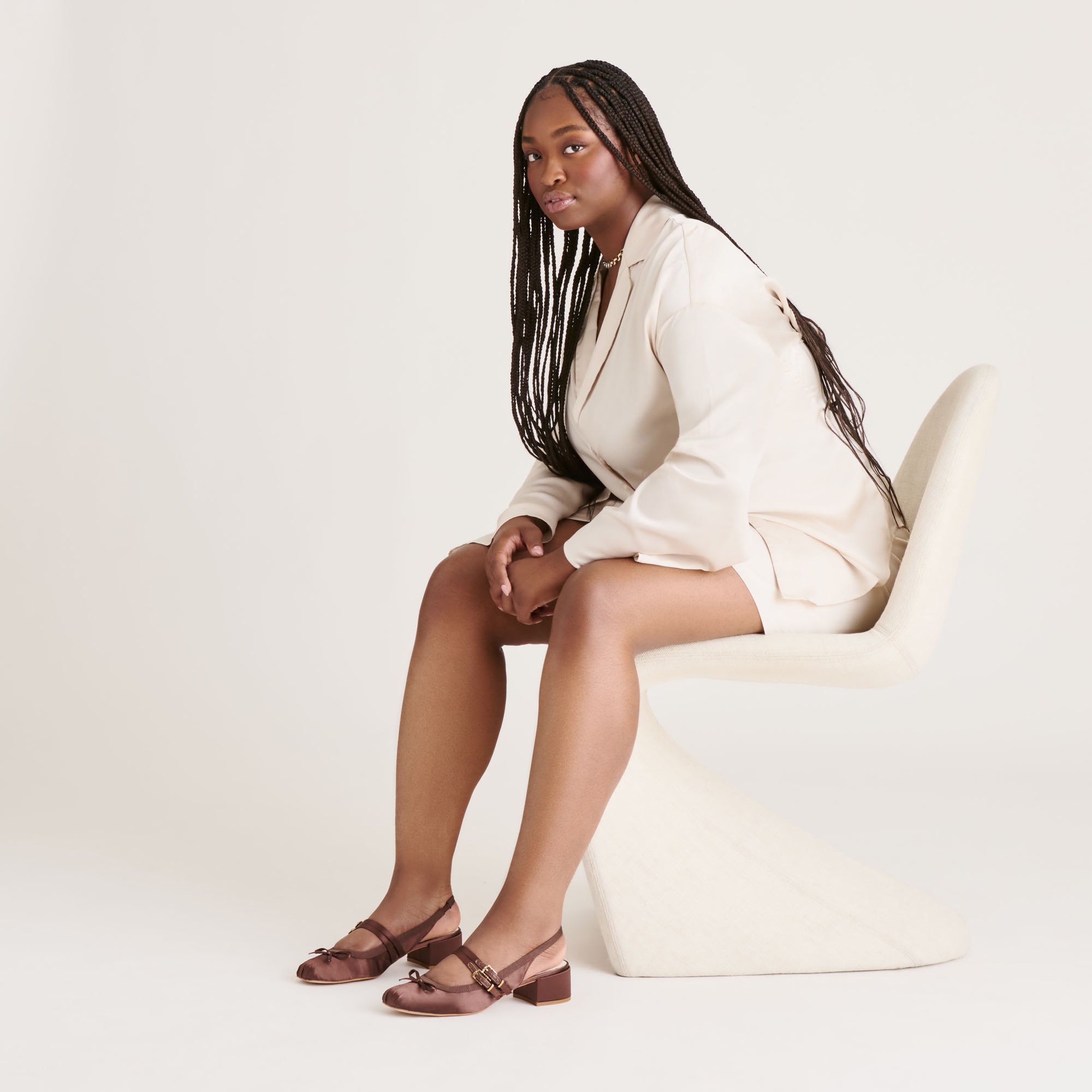 LORIS combines the look of an authentic ballet flat with a retro silhouette. This satin slingback’s low block heel is comfortable for all day wear while her double mary-jane strap and delicate bow add a vintage-inspired touch. Choose from rich mahogany or feminine blush colorways.