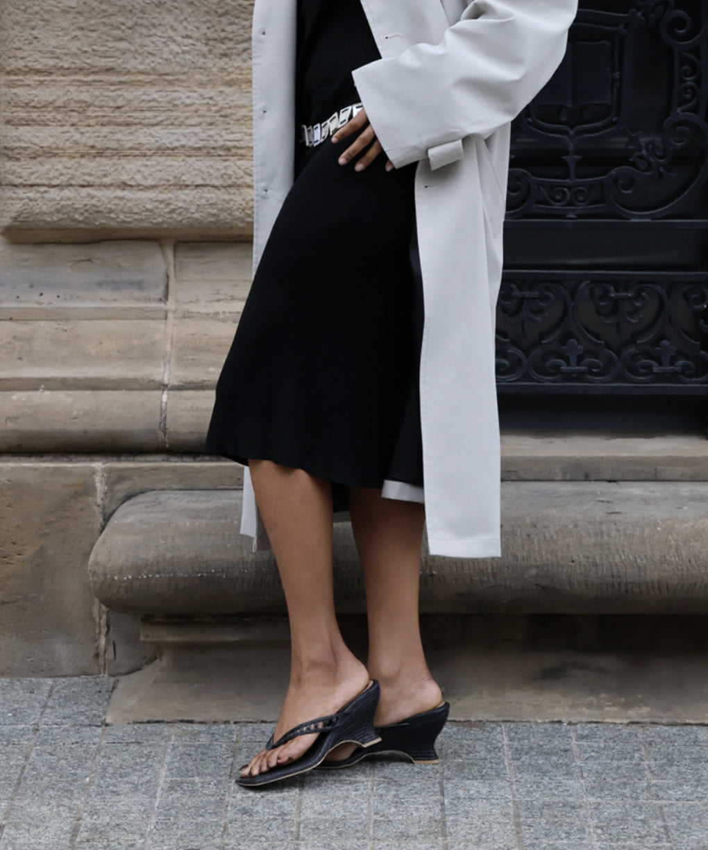 NULLAH is a cool and casual take on the resurgence of the wedge. Her uniquely shaped wedge sole is complimented by an understated thong sandal design.