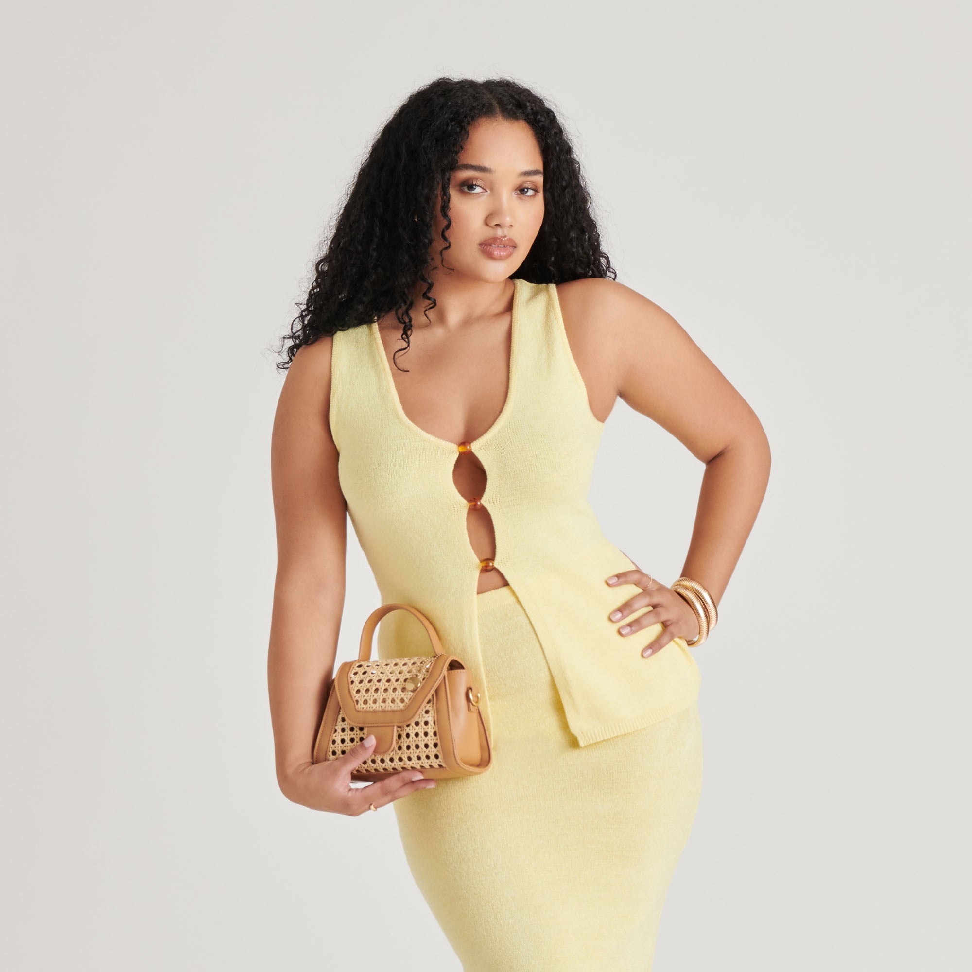TROPEZ packs a punch with her woven rattan-inspired design and sleek silhouette. Convertible from a structured top handle to a practical crossbody. she’s versatile with a certain timeless je ne sais quoi.
